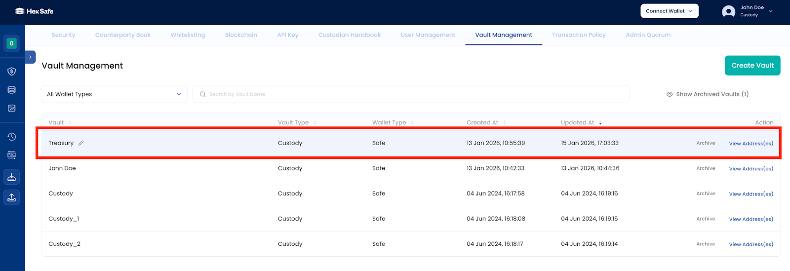 This article explains how to manage vaults in Hex Safe using the self-service vault management feature. Vaults are used to securely store and manage digital assets and control transaction access.